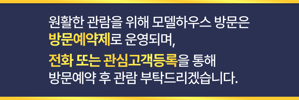 관심고객 등록 시 분양정보 및 모델하우스 위치를 휴대전화로 발송 및 안내드립니다. 모델하우스 방문은 예약제로 운영되며 전화 또는 관심고객등록을 통해 방문예약 부탁드리겠습니다.