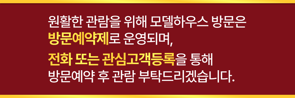 관심고객 등록 시 분양정보 및 모델하우스 위치를 휴대전화로 발송 및 안내드립니다. 모델하우스 방문은 예약제로 운영되며 전화 또는 관심고객등록을 통해 방문예약 부탁드리겠습니다.
